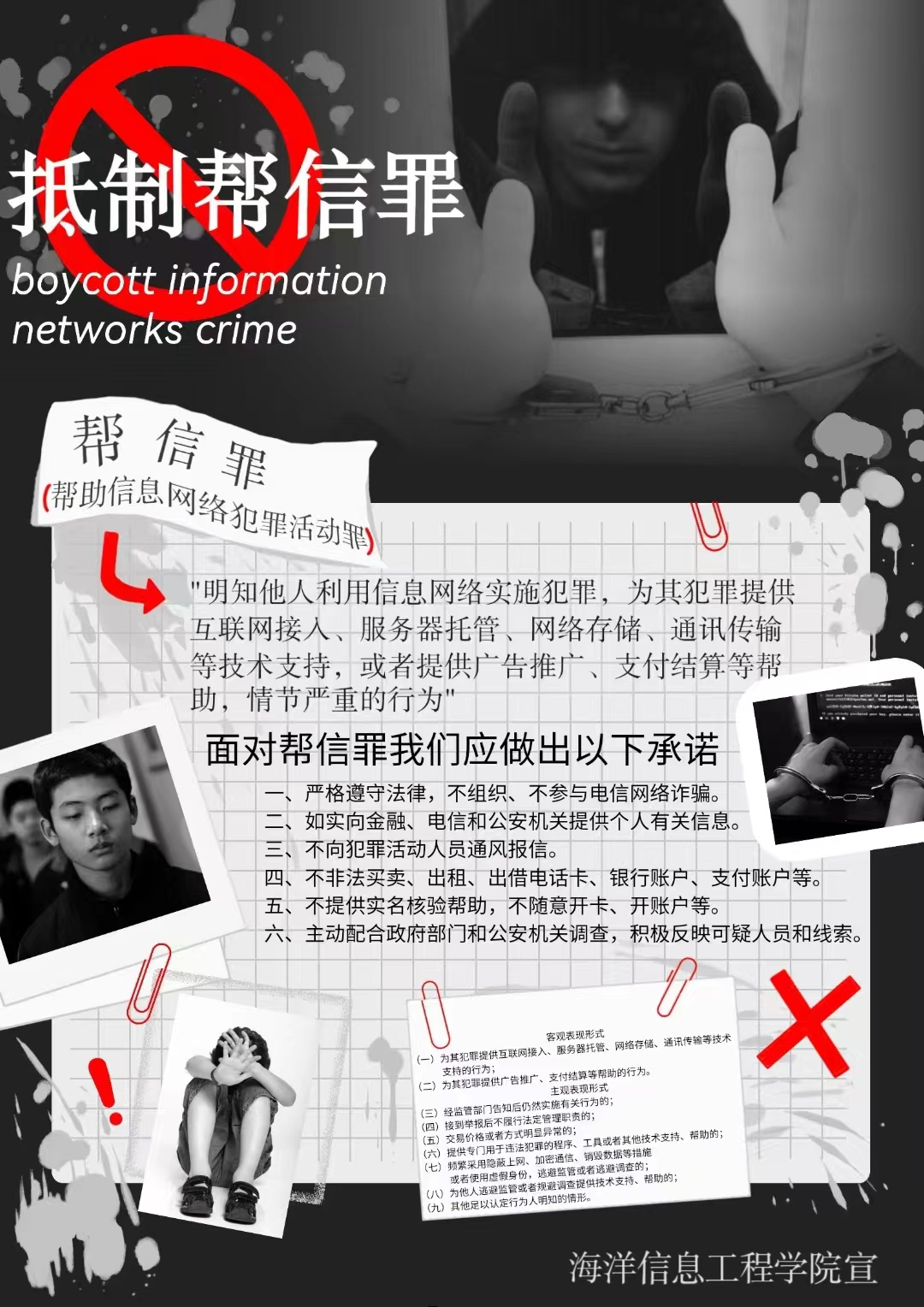 学院高度重视“防范帮信罪”安全教育,院学工办认真部署,张贴了有关防范抵制“帮信罪”的宣传教育海报。班主任通过班会详细介绍了什么是“帮信罪”?并结合案例,介绍了不法分子作案手法,班会上宣读并要求全体同学签署《抵制帮助信息网络犯罪活动罪》承诺书,增强防范并抵制帮信罪的安全意识,强化法治观念,为促进海南自由贸易港的建设贡献大学生的青春力量!