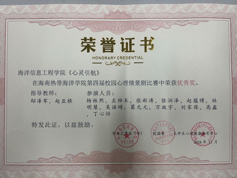 2024年12月18日,学校大学生心理健康教育中心在体育馆前举办海南热带海洋学院第四届心理剧比赛,德赢官网12位同学参演的《心灵引航》荣获决赛优秀奖。