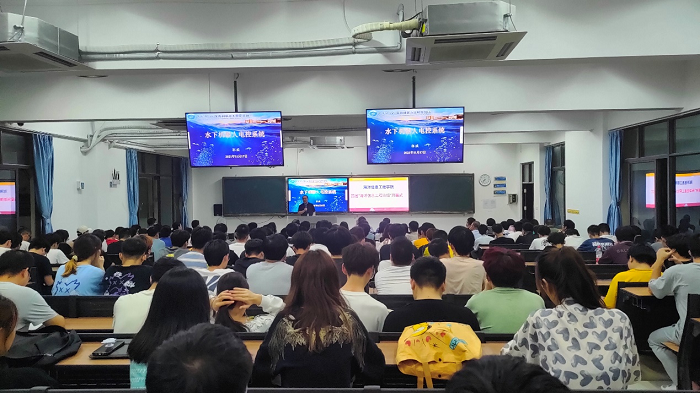 郭威主任运用多媒体的形式,围绕几种典型的水下机器人、水下机器人电控系统、传感器与执行器、水下机器人控制技术、海洋信息技术的典型应用、对教学和科研的体会六个方面作了精彩的报告。从水下机器人的发展历程切入,层层深入,并与在场的老师和学生进行学术交流,报告精彩热烈,气氛活跃。